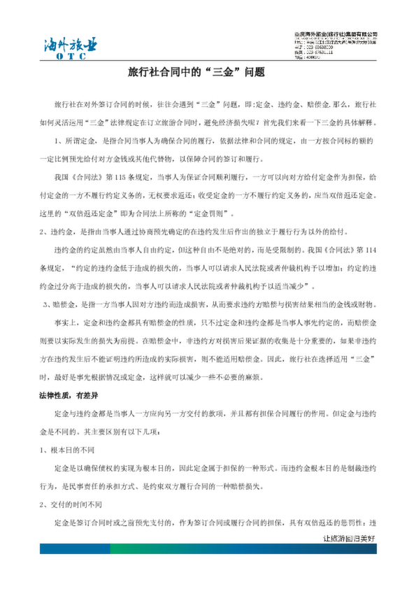 旅行社在對外簽訂合同的時候,往往會遇到“三金”問題,即:定金、違約金、賠償金.那么,旅行社如何靈活運用“三金”法律規(guī)定在訂立旅游合同時,避免經(jīng)濟(jì)損失呢?首先我們來看一下三金的具體解釋。
