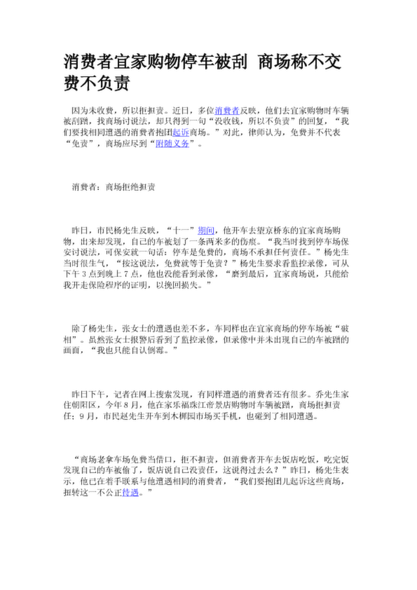 消費(fèi)者宜家購(gòu)物停車被刮 商場(chǎng)稱不交費(fèi)不負(fù)責(zé)