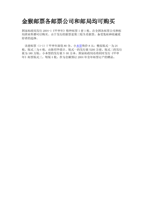 金猴郵票各郵票公司和郵局均可購買