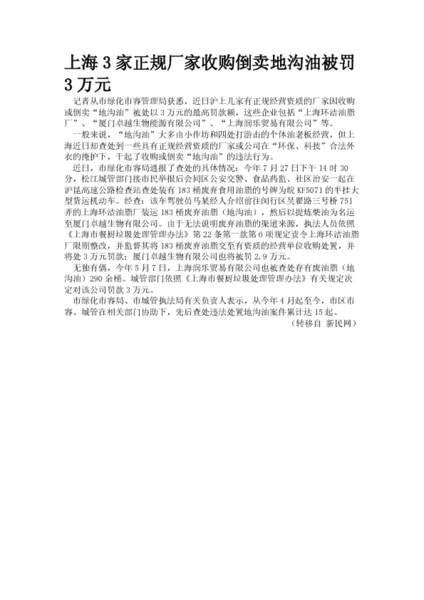 上海3家正規(guī)廠家收購倒賣地溝油被罰3萬元