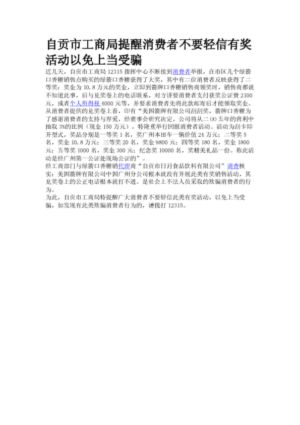 自貢市工商局提醒消費者不要輕信有獎活動以免上當(dāng)受騙