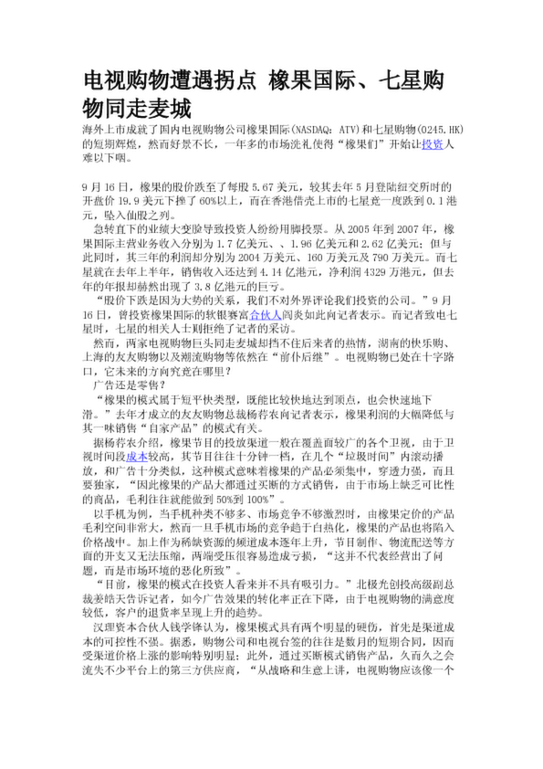 電視購(gòu)物遭遇拐點(diǎn) 橡果國(guó)際、七星購(gòu)物同走麥城
