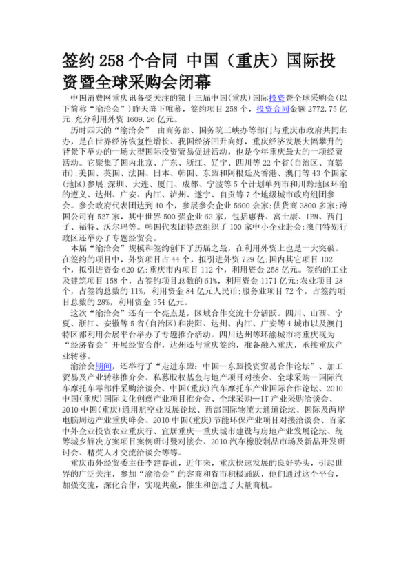 簽約258個(gè)合同 中國(guó)(重慶)國(guó)際投資暨全球采購(gòu)會(huì)閉幕