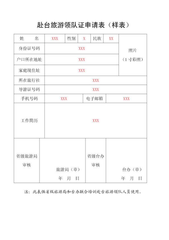 赴臺旅游領隊證申請表(樣表)