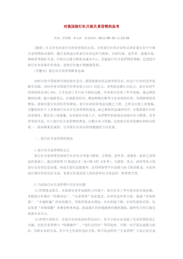本文首先從旅行社的經(jīng)營現(xiàn)狀出發(fā),分析旅行社的企業(yè)特點和在旅行社中開展關(guān)系營銷的必要性,隨后系統(tǒng)地分析旅行社該怎樣與顧客、內(nèi)部市場、競爭者、流通市場、影響者等搞好關(guān)系,并提出以建立顧客忠誠為中心、實施旅行社關(guān)系營銷的策略,達(dá)到適應(yīng)旅行社外部條件的變化,使旅行社能長期健康發(fā)展.