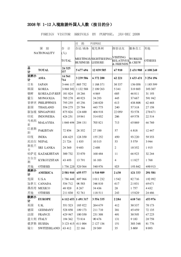 2008年 1-12入境旅游外國人人數(shù)(按目的分)的數(shù)據(jù)報告