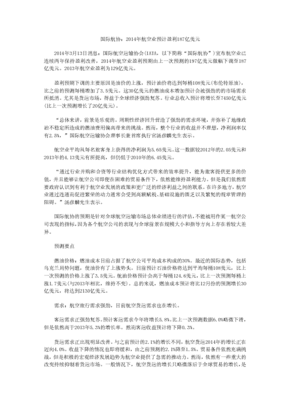 國(guó)際航協(xié):2014年航空業(yè)預(yù)計(jì)盈利187億美元(19.00KB)