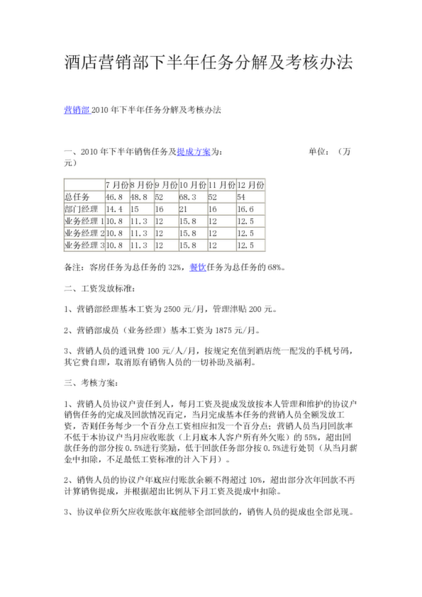 營(yíng)銷業(yè)績(jī)完成與否,營(yíng)銷總監(jiān)和部門經(jīng)理參照酒店 2011 年經(jīng)營(yíng)績(jī)效考核責(zé)任書規(guī)定執(zhí)行...經(jīng)理的考核 任務(wù); 2、營(yíng)銷部?jī)?nèi)部實(shí)行任務(wù)分解不影響總?cè)蝿?wù)數(shù)的完成和業(yè)績(jī)提成獎(jiǎng)...