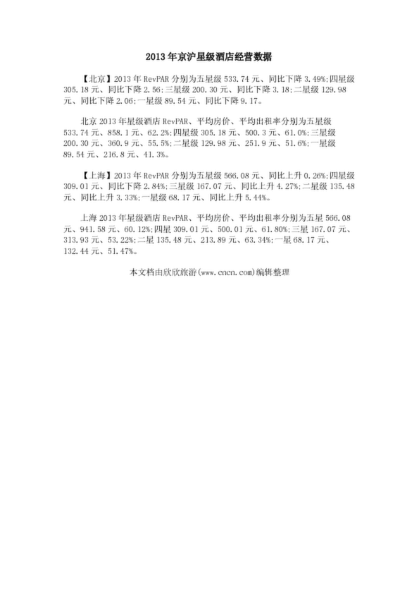 2013年京滬星級(jí)酒店經(jīng)營(yíng)數(shù)據(jù)