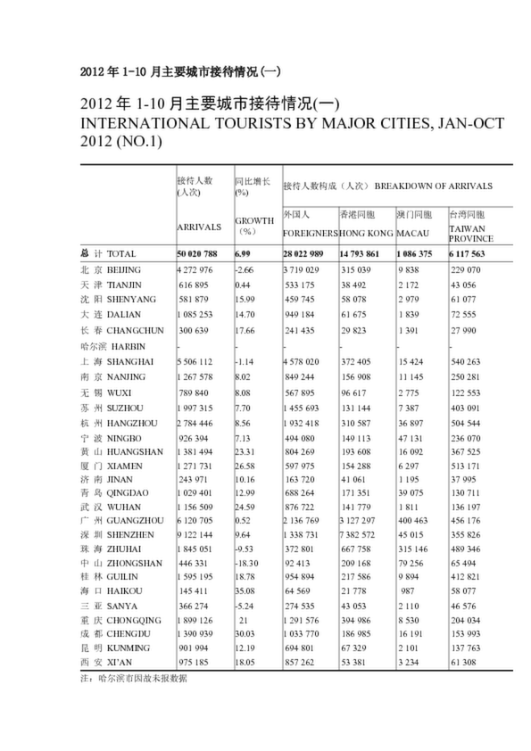 2012年1-10月主要城市接待情況(一)