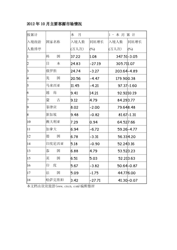 2012年10月主要客源市場情況