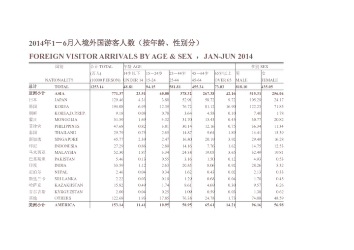 2014年1-6月入境外國游客人數(shù)(按年齡、性別分)