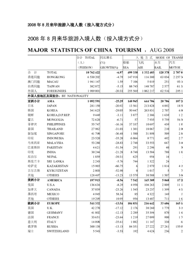 2008年8月來華旅游入境人數(shù)(按入境方式分)(0.14MB)