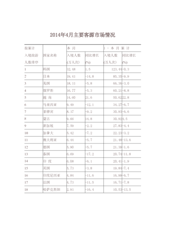 2014年4月主要客源市場情況