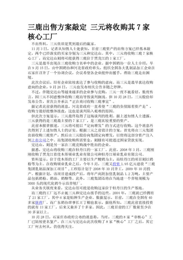 三鹿出售方案敲定 三元將收購其7家核心工廠(22.15KB)